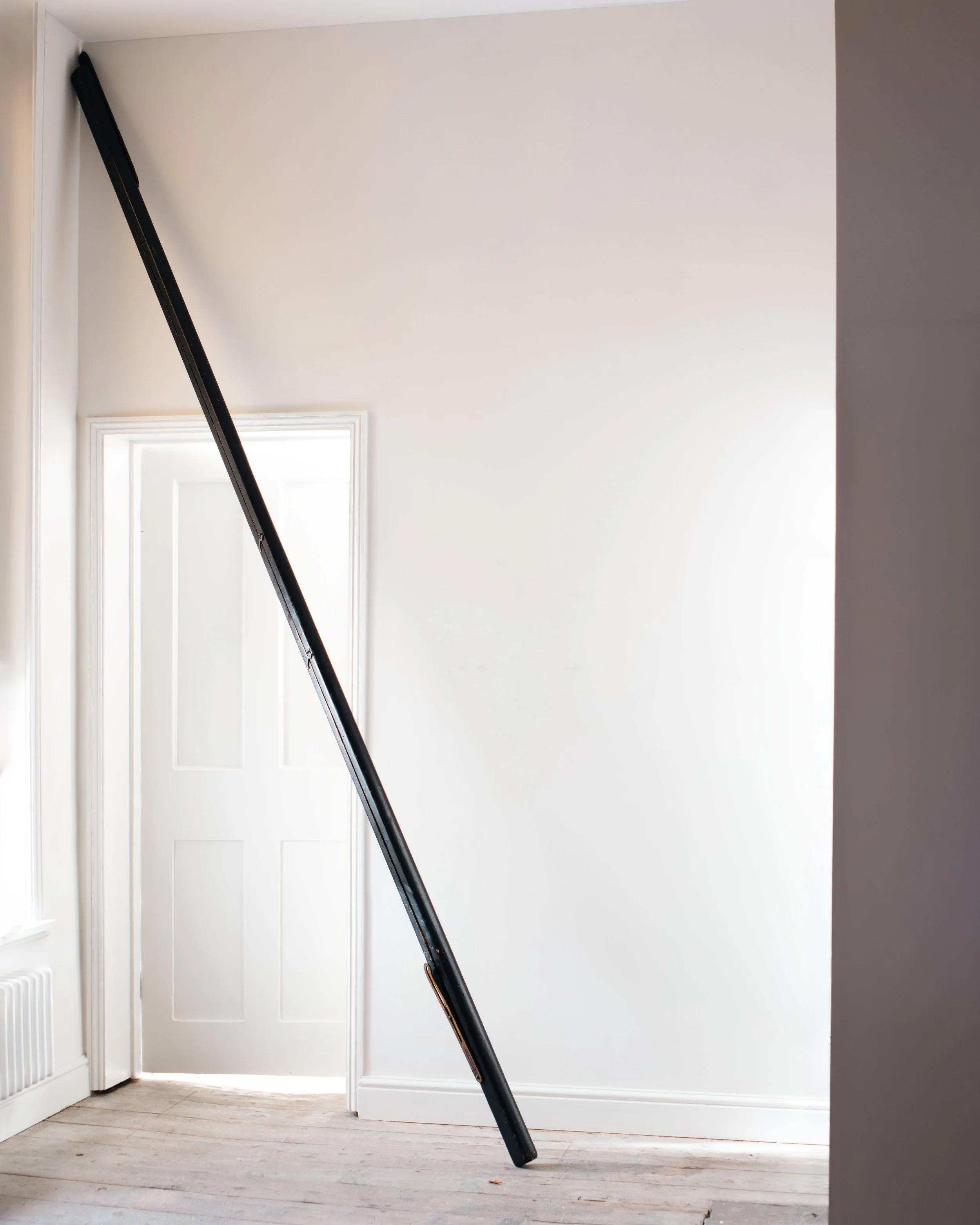 THIS VERY TALL LADDER HAS A DARK EBONISED SURFACE, LIGHTLY WORN IN PLACES OF USE. IT HAS A SLIDE ACTION (WITH THE MAKER’S MARK ‘SYERS IMPROVED SLIDE’ ON THE BRASSWORK), TO METAMORPHOSE INTO A SINGLE POLE, HELD TOGETHER BY TWO HOOKS AND EYES.